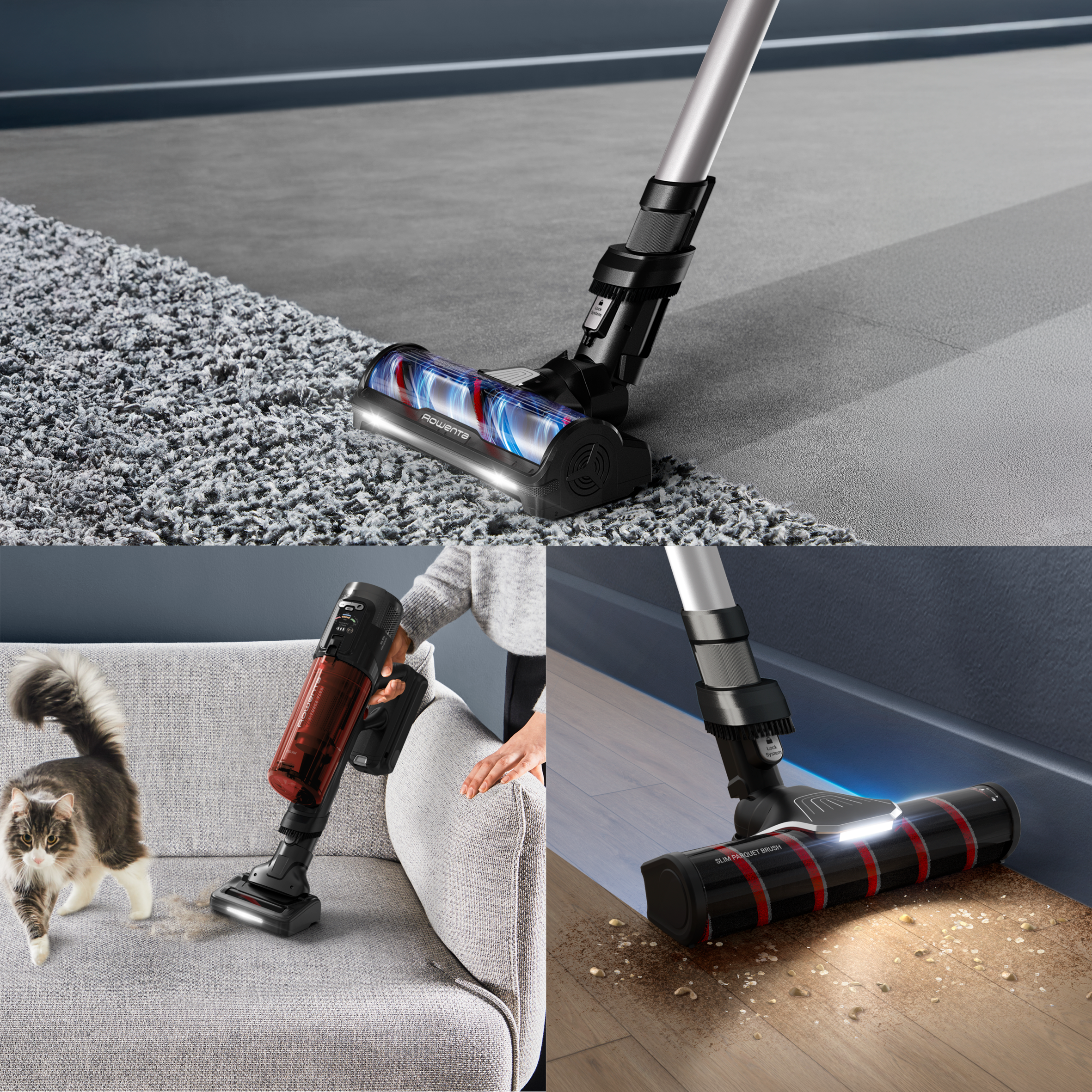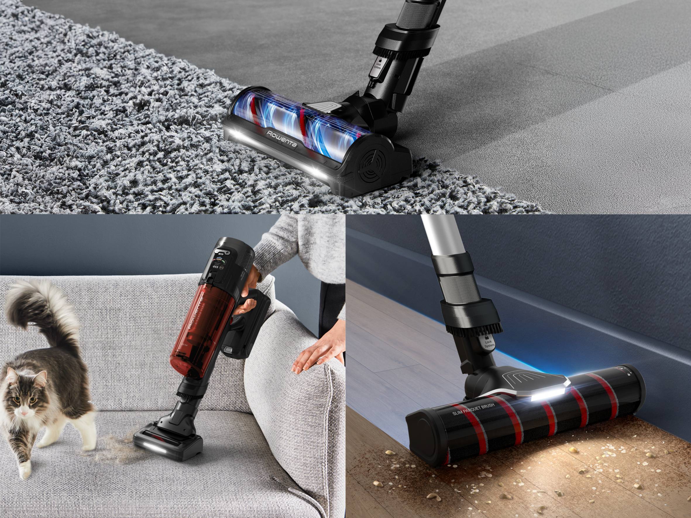Van vloer tot plafond: drie borstels voor een huis dat écht schoon is. De borstel voor alle vloeren zorgt voor een grondige reiniging, zelfs op tapijt. De speciale parketborstel met LED-verlichting levert uitzonderlijke prestaties op oppervlakken zoals parket. En de animal turboborstel met LED-verlichting verwijdert moeiteloos dierenharen.